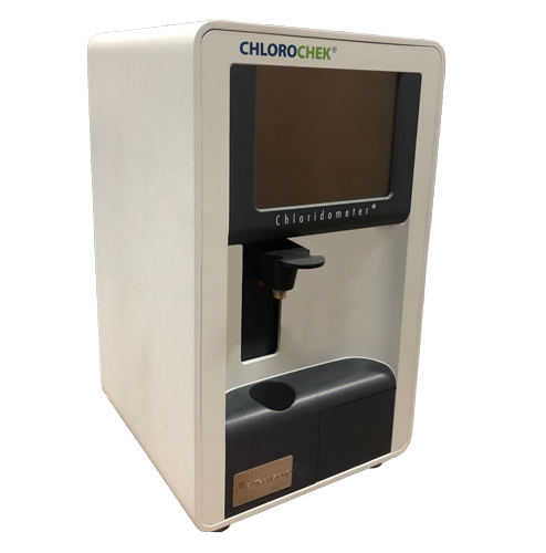 ChloroChek Chloridometer to titrator kulometryczny przeznaczony do określania stężenia jonów chlorkowych w próbkach potu zawierających zaledwie 10 mikrolitrów potu. Wyświetla stężenie bezpośrednio w mmol/L Cl. Próbka potu jest dodawana do roztworu roboczego buforu kwasowego/stabilizatora. Jony srebra są generowane przez elektrolizę z elektrod srebrnych również zanurzonych w roztworze roboczym. Połączenie jonów srebra i jonów chlorkowych (z próbki potu) jest reakcją ilościową, która jest rejestrowana w czasie rzeczywistym i jest proporcjonalna do stężenia jonów chlorkowych w próbce potu.